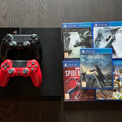 Playstation 4 med spill og en kontroller