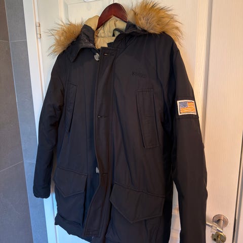 Svea vinterjakke, laget av nylonmateriale. Jakken er i størrelse L og designet for menn. Den har hette med pelskant.