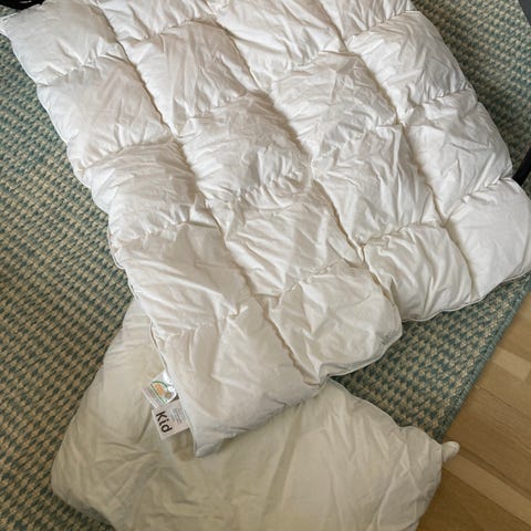 Pent brukt babydyne og pute. Dynen er fra Dozy og puten fra Princess. Nyvasket veldig små flekker på dynen (se bilde).