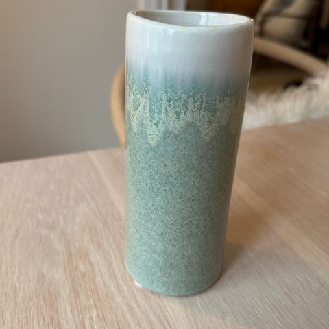 Dekorativ vase i keramikk. Høyde 24,5 cm, diameter ca 18 cm på det bredeste.