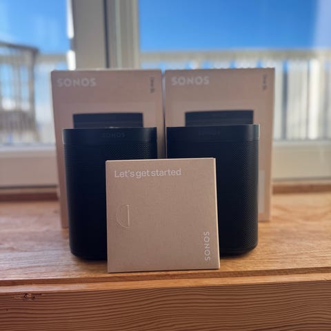 Sonos høyttaler i hvit farge med trådløs tilkobling og Ethernet-port. Designet for lydavspilling i ulike rom.