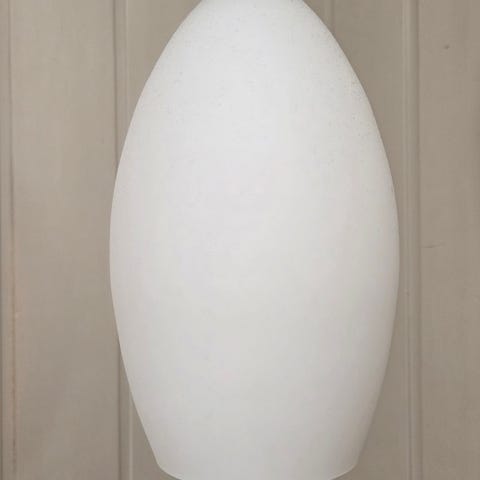 To stk stilige takpendler i glass med ledning og felles støpsel (hjemmegjort, kan/bør endres). Max 40W pære. Hver lampe har en ca. 145 cm lang ledning med innretning til oppheng. Se bilder.