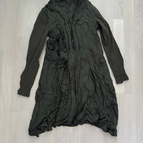 Kul hverdagskost fra Desigual, glidelåslukking foran i hele lengden, kombinasjon av denim, stretchy cordfløyel, kunstskinn, "loddent" stoff og innvevd sølvtråd. Applikasjon nederst på venstre side. Lite brukt, ingen flekker eller skader. Stretchstoff i sidene på overdelen + mulighet for å stramme inn livet på begge sider for en figurnær look. Materialer: 75% bomull, 10% polyester, 8% akryl, 5% ull, 2% andre materialer (=metalltråd).