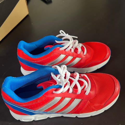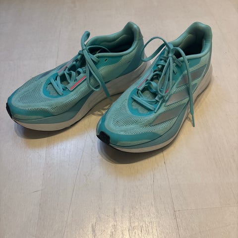 Adidas løpesko i størrelse 39. Skoene er designet for løping og har en tekstiloverdel med mesh for pusteevne. Sålen har et mønster som gir grep, og skoene har snøring for justerbar passform. Fargen er hovedsakelig lilla med hvite detaljer.