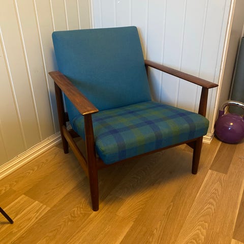 Farge: petroliumsblå med tilhørende pute i lys blått stoff.