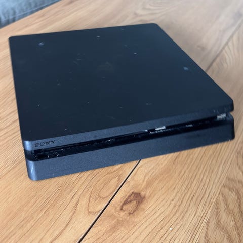Sony PlayStation 4 spillkonsoll i svart farge. Konsollen har et kompakt design og leveres med en trådløs kontroller. Egnet for gaming på PlayStation-plattformen. The device still works but can be a bit noisy with the fan, comes with a docking station and a controller.
