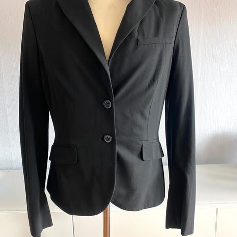 Stilig dressjakke/blazer fra Mexx selges. Den har et flatterende snitt, med innsving mot midjen. Jakken er i mørk grå med smale striper, som gjør den klassisk og elegant. Passer til en dag på kontoret eller til en mer festlig anledning, med rett tilbehør. Størrelse 38/M.