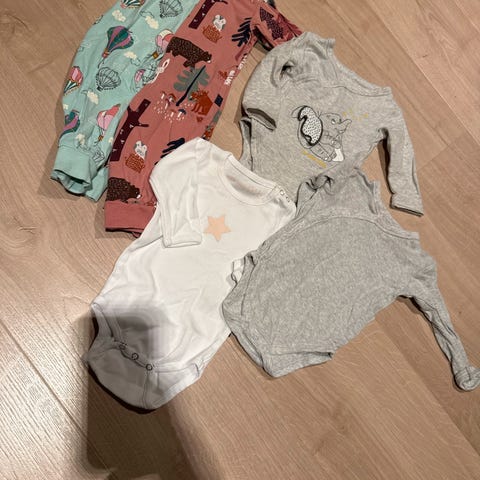 Mange bodyer, noen fint brukt og et par med litt flekker. Bukser, en genser, litt ull, en pysj og en jumpsuit.