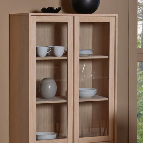 Mer informasjon hos Bohus: https://www.bohus.no/oppbevaring/vitrineskap/raffels-vitrineskap-b-95