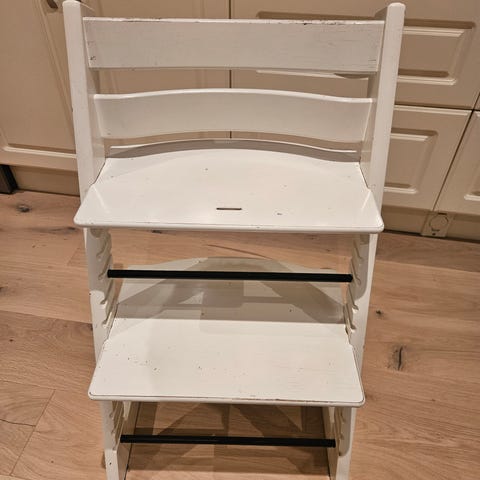 Stokke barnestol med polstret sete og sikkerhetssele. Designet for barn og laget med fokus på komfort og sikkerhet.