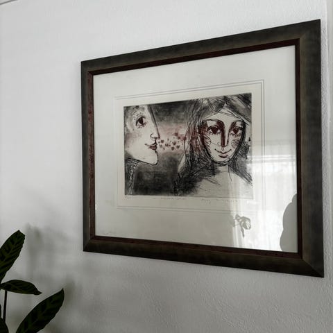 “Stupedama” er et sterkt og samtidig sårbart motiv av Bjørg Thorhallsdottir, kjent for sin særegne strek og varme, menneskelige uttrykk. Verket formidler mot, frihet og det å våge – øyeblikket før man slipper taket og kaster seg ut i noe nytt. Med sin intuitive og følelsesdrevne stil skaper Bjørg et bilde som treffer både hjertet og magen, og som gir rommet personlighet og mening.