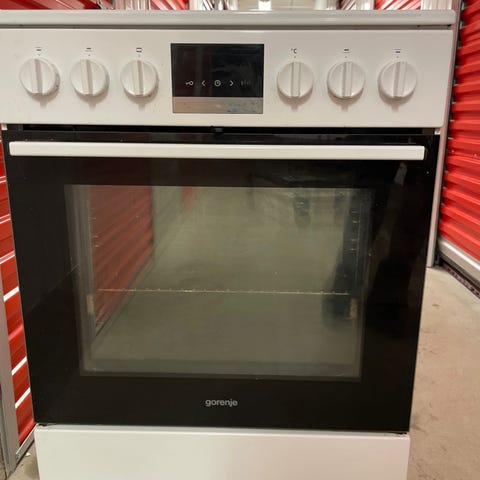 Gorenje keramisk komfyr med keramisk kokeplate og integrert ovn. Komfyren har en hvit farge og manuelle knotter for enkel betjening.