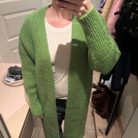 Mango cardigan i ull, farge grønn, (lys turkis) størrelse M for kvinner. Cardiganen har ribbestruktur og knapper med dekorative detaljer, puffermer. Lappen er klippet av, men det er ull og polyester.