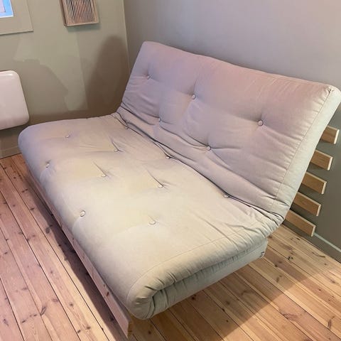 Madrassen er blågrå (mer blå enn på bildene). Det følger med en ekstra futonmadrass som er mørkegrå. Madrassbeskytter og laken kan også følge med hvis ønskelig.