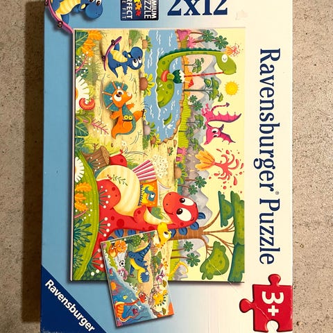 Ravensburger puslespill med 2x12 biter, designet for barn fra 3 år og oppover. Puslespillet har fargerike illustrasjoner med ulike kjøretøy og scener.