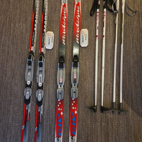 Selger to sett langrennskipakker. Skoene er i størrelse 33 og 34. Skiene er smøreski. Lengden på skiene er snaue 120 cm. Selges for 450 kr pr pakke.
