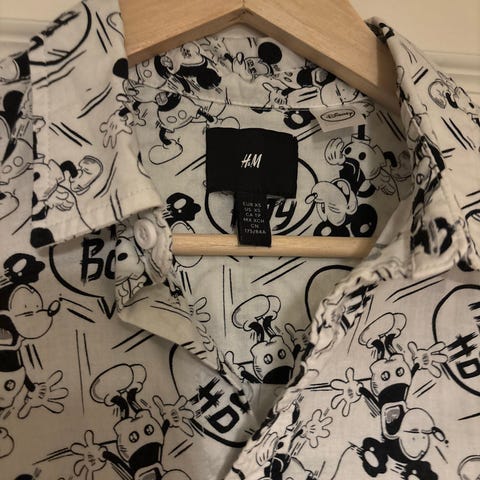Skjorte fra H&M med klassisk Mikke Mus motiv, selges til 50kr. Svært pent brukt. Hentes på Tyholt eller sendes med FiksFerdig