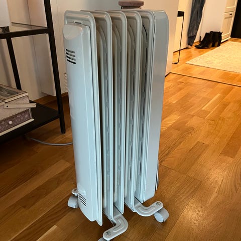 Oljeovn i grå farge med flere varmeelementer. Utstyrt med kontrollknapper for temperaturinnstilling og justering. Har hjul for enkel flytting og ledning for tilkobling til strøm.