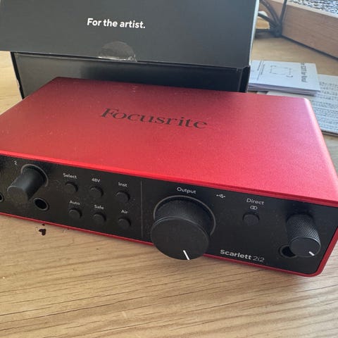 Pent brukt Focusrite Scarlett 4i4 selges, fordi jeg har to Scarlett lydkort. Denne utgaven har MIDI inn, som har funka supert for å koble til et gammelt elpiano, og bare behøve en kabel til PC.