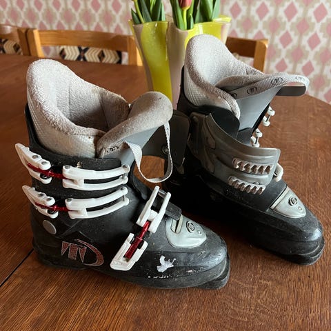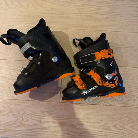 Tecnica skistøvler for barn i hvit og lilla farge. Skistøvlene er utstyrt med en spenne for justering og god passform.