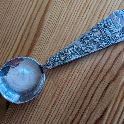 suvenirskje, minneskje, samlerskje, sølvplett, nysølv, Norge, Akershus, Trondheim, Molde, Stavanger, Lillehammer, Nord-Norge, Gudvangen, Mandal, Notodden, Heggenes, Henrik Ibsen, Olav Tryggvason, USA, Empire State Building, Minnesota, North Dakota, Asia, Fu Lu Shou, retro, vintage