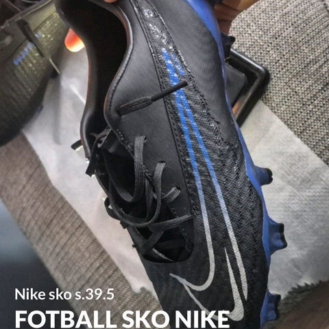 Nike fotballsko i sølv og gul farge. 200 kr per fotballsko, str. 40 og 40,5. Kr. 100 for leggskinn, str. L. Veldig pent brukt.