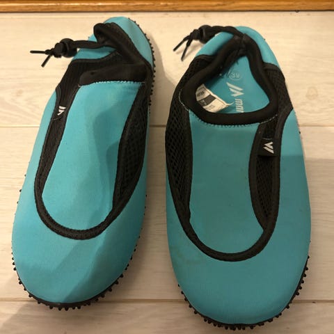 Dysmi badesko i størrelse 35, blå med hvite prikker. Skoene har en fleksibel og gummiert såle som gir grep
