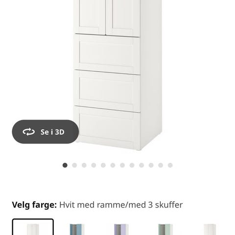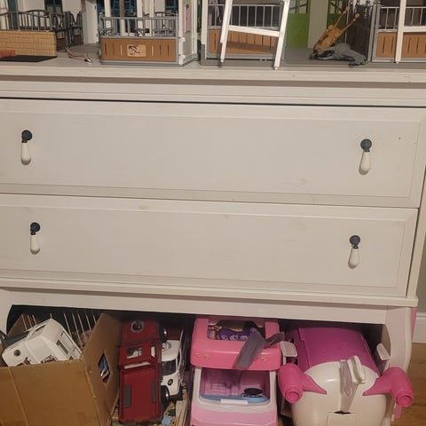 Romslig og solid klesskap, brukt på barnerom. Ukjent merke/type, står «Made in Denmark» på det. Skuff på hjul til leker etc.
