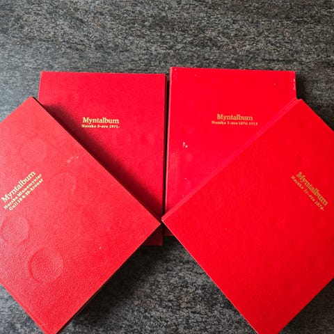 To røde album, har tatt bilde av sidene som har mynter. Har ikke kontrollert at myntene er satt korrekt inn, så det er viktig å stille spørsmål ved interesse for enkeltmynter. Har ikke kompetanse til å vurdere kvalitet, men kan t flere bilder på forespørsel. Selges samlet til høystbydende over NOK 100. Kan sendes mot porto og emballasje eller hentes i Bergen. Se øvrige annonser ved ønske om samsending.