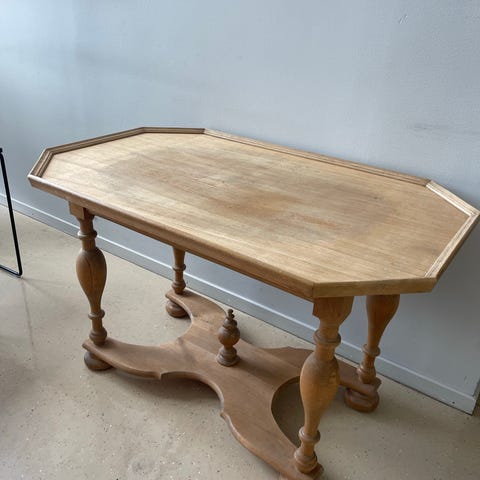 Selger et solid og unikt bord med vakre detaljer. Usikker på tresort, men bordet er tungt og fremstår som laget i massivt tre.