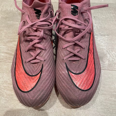 Nike Mercurial fotballsko i grått og rosa. Skoene har knotter under sålen for bedre grep på gressbaner. Designet for fotballspillere, med snøring og ankelstøtte. Materialet er syntetisk og gir lettvektsegenskaper.