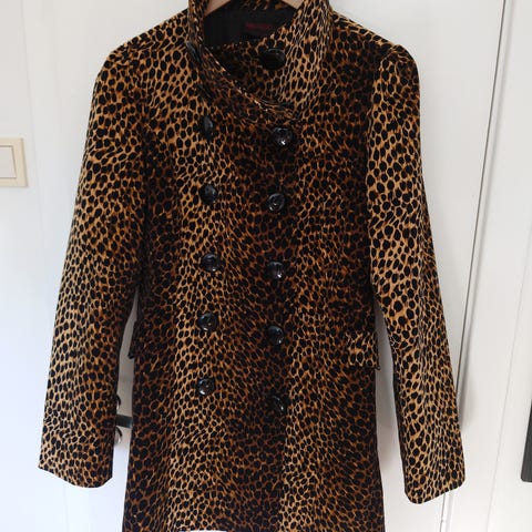Kåpen er nesten ikke brukt. Den er foret og har skrålommer. Lett og behagelig i fargen brun/svart med fint mønster.