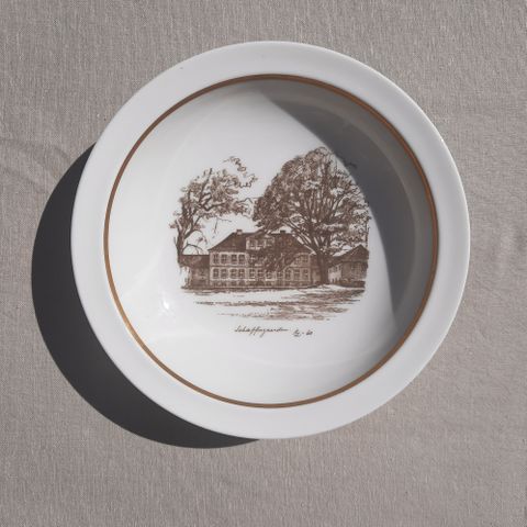 Tallerkenen er 10,5 x 10,5 cm. Det er en liten skade på høyre side som kan sees på bildet. Den selges for kr. 90