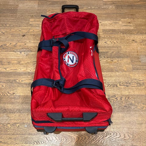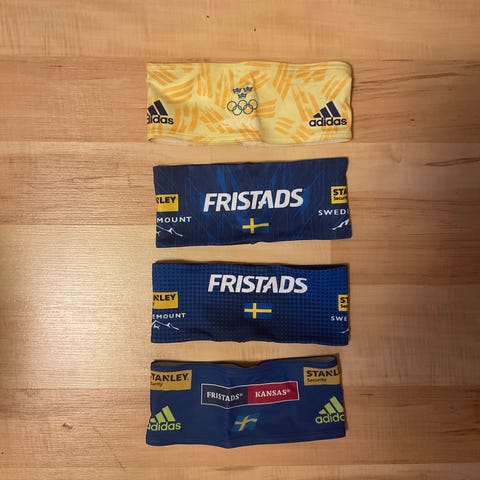 2 ski-luer, ett pannebånd og ski-stropper. Ene lua er fra Ski-VM i Trondheim