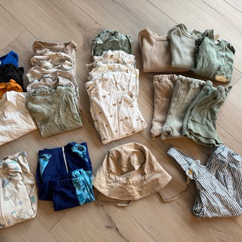 En fin klespakke I strl 86 noen klær i strl 92. Denne klespakken inneholder: 10 gensere, 1 hvit skjorte, 1 blå strikkejakke, 1 heldress fra heldre, 8 tskjorter, 2 bukser, et blått sett fra Adidas (er et bilde på noen flekker på genseren). Dette er klær som for det meste er brukt som bytte klær i barnehagen, det er fortsatt mye bruk igjen i alle klærene.