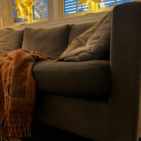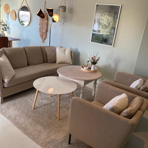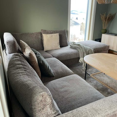 Gruppa består av en fireseter, toseter og en puff i fargen Delux brown. En varm gråfarge.