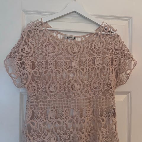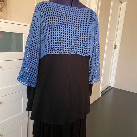 En løstsittende T-skjorte med god vekt, som henger pent og har et særegent heklet utseende. Det heklede kamskjellmønsteret veksler mellom svarte og beige farger. Den har lave skuldersømmer og nydelige ribbestrikkede kanter. Kvaliteten, 100 % økologisk bomull, sammen med den «hullete» strukturen og den løstsittende passformen, gjør plagget slitesterkt, luftig og elegant. Den luftige strukturen og myke bomullen gjør dessuten at t-skjorten egner seg til både hverdagsbruk og avslapning.