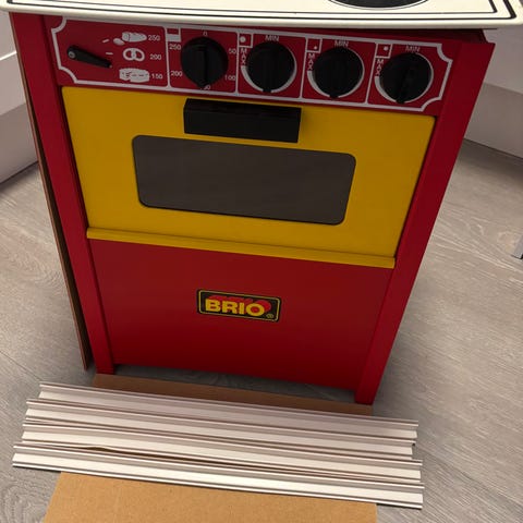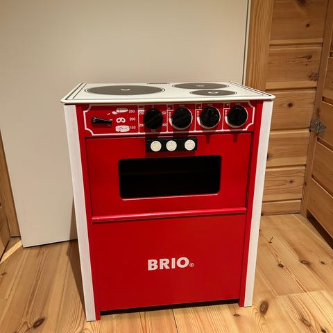 BRIO lekekjøkken i tre med rød farge. Inkluderer komfyr med tre kokeplater og ovnsdør med vindu som kan åpnes..