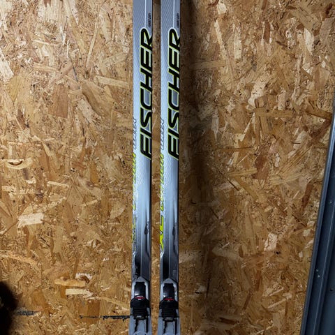 Fischer langrennski. Skiene har gul og hvit farge, og inkluderer bindinger. Egnet for langrenn.