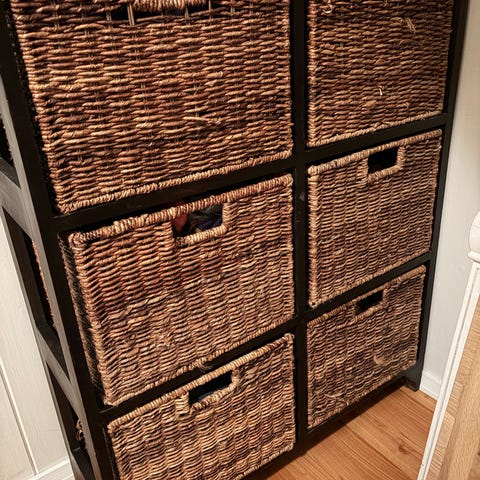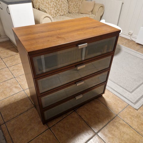 Kommode fra IKEA. Pent brukt, vært uheldig at den ene hvite planken over skuffen i midten har brekt så den er tatt bort. Mulig å fikse. Derfor selges billig. Ønske om rask henting. Ny pris 1.995