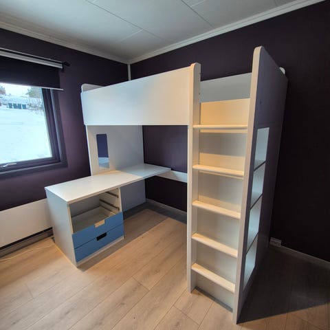 Praktisk og plassbesparende loftseng i grå farge. Skapet som vises på bildet følger med sengen og gir ekstra oppbevaringsplass. Det er god plass under sengen, perfekt til oppbevaring eller sitteplass.