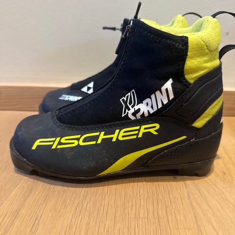 Fischer XJ sprint langrennsko i svart og gul farge med glidelås.