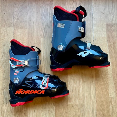 Nordica alpinstøvler i størrelse 24.0-24.5 med svart ytterskall og blått innerfôr. Støvlene har fire spenner for justering og er laget for alpint bruk.