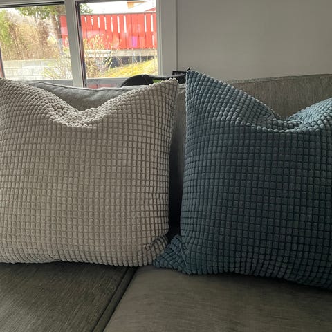 Sett av to puter m/trekk selges da det ikke blir brukt. Nydelig, dyp grønnfarge. Den ene siden har tekstur i stoffet, mens andre siden er i velour.