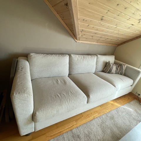 Fint lyst sett av sofaer 2+3, skinn, brukt, slitasje noen steder, se f. eksempel se det ene bilde. Den mindre sofaen er mindre slitt. Bordet følger ikke med.