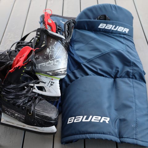 Komplett skøytesett bestående av Bauer hockeyskøyter, sokker, shorts, hansker, hjelm med visir samt annet nødvendig beskyttelsesutstyr.