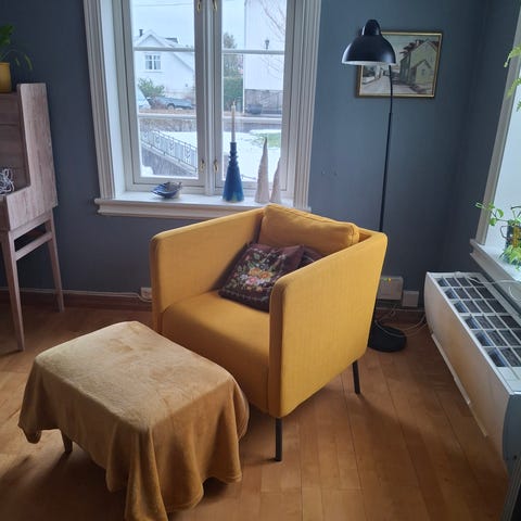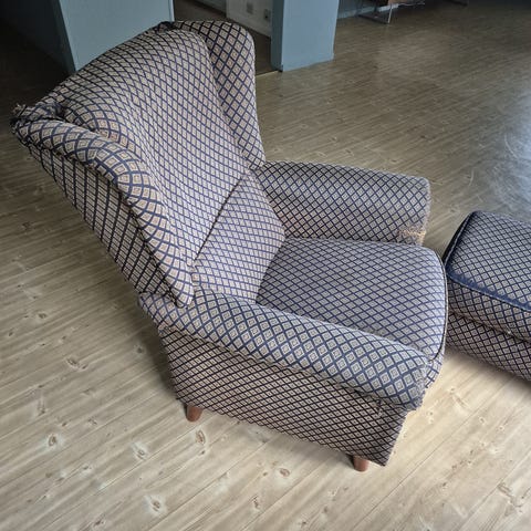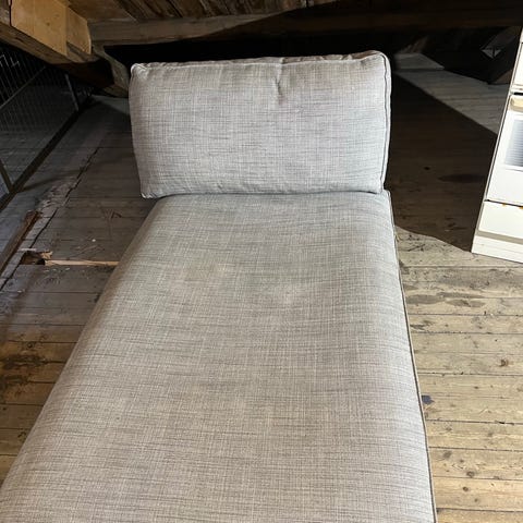Litt flekkete men dette tror jeg skal gå av med en vask med klut. Veldig grei stol og seng til gjesterommet etc.