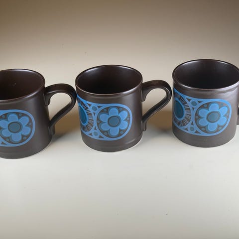 Sett med 5 vintage krus fra 1970-tallet, produsert av Staffordshire Pottery, England. Krusene er hele og i svært fin stand, og fremstår nesten ubrukte.