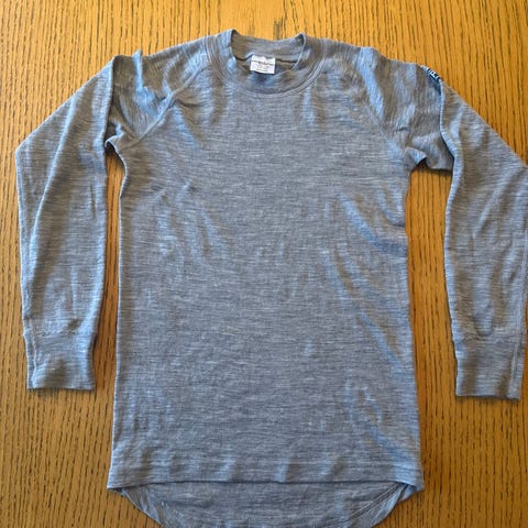 Tynn ullgenser i 100 % merinoull fra Polarn O. Pyret. Grønn. Den har noen antydninger til flekker, men de vises ikke på bildet og man må se veldig nøye for å få øye på de. Ellers ser den ny ut. Dette er klær av god kvalitet. Brukt av et barn.