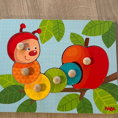 HABA Frukthagen brettspill med illustrasjoner av frukttrær og kurver. Spillet inkluderer flere brett med ulike frukttrær og små kurver i tre. Egnet for barn og familier som ønsker et enkelt og pedagogisk spill.